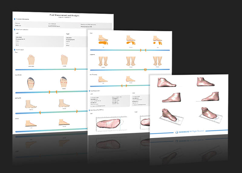 (FootStation Pack 3Dスキャンを使用すると、かかとからつま先までの詳細なサイズ分析レポートが得られます。)