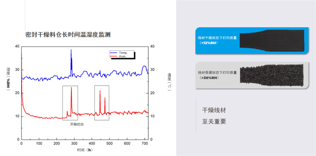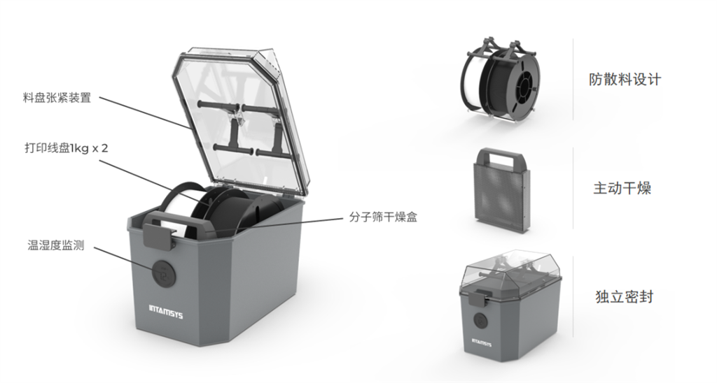 Combined with engineering material support solutions, it ensures the molding quality of complex structural objects, flexibly realizing dual-drive gear extrusion for replication and mirror printing, resulting in greater torque and higher reliability. Dual-channel cooling provides stronger cooling capacity and automatic speed adjustment. The overall sealed material chamber design, coupled with reusable molecular sieves, and active moisture absorption function maintain low humidity within the material chamber for extended periods, eliminating the need for repeated filament drying and ensuring long-term printing quality for moisture-absorbing materials such as nylon (PA) .